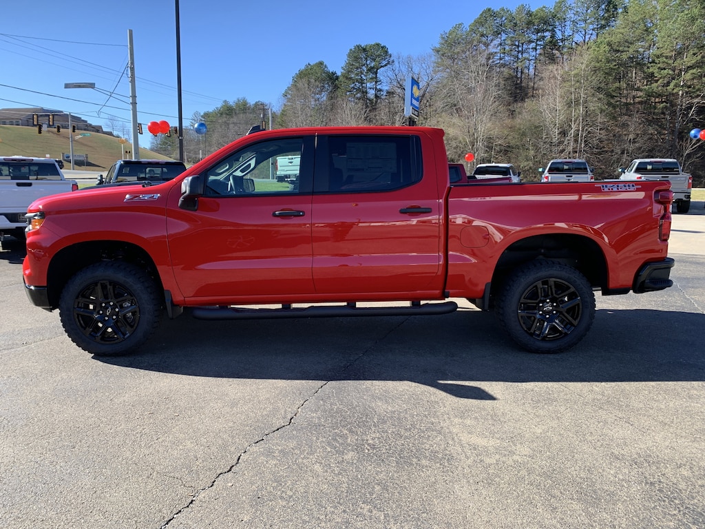 Red Hot 2026 Chevrolet Silverado 1500 Custom Trail Boss 4WD 10-Speed Automatic EcoTec3 5.3L V8 10-Speed Automatic, 4WD, Jet Black Cloth, 10-Way Power Driver Seat w/Lumbar, 120-Volt Bed Mounted Power Outlet, 120-Volt Interior Power Outlet, 220 Amp Alternator, 3.5' Monochromatic Display Driver Info Center, 4-Wheel Disc Brakes, 4' Black Round Assist Steps (LPO), 40/20/40 Front Split-Bench Seat, 6 Speakers, 6-Speaker Audio System, ABS brakes, Air Conditioning, Alloy wheels, AM/FM radio: SiriusXM, Apple CarPlay/Android Auto, Auto High-beam Headlights, Auto-Locking Rear Differential, Automatic Emergency Braking, Bluetooth For Phone, Brake assist, Chevytec Spray-On Black Bedliner, Cloth Seat Trim, Color-Keyed Carpeting Floor Covering, Compass, Custom Convenience Package, Deep-Tinted Glass, Delay-off headlights, Driver door bin, Driver vanity mirror, Dual front impact airbags, Dual front side impact airbags, Dual Rear USB Ports (Charge Only), Electric Rear-Window Defogger, Electronic Cruise Control, Electronic Stability Control, Emergency communication system: OnStar, EZ Lift Power Lock & Release Tailgate, Following Distance Indicator, Forward Collision Alert, Front anti-roll bar, Front Center Armrest w/Storage, Front Pedestrian Braking, Front reading lights, Front Rubberized Vinyl Floor Mats, Front wheel independent suspension, Fully automatic headlights, HD Rear Vision Camera, Heated door mirrors, Heavy-Duty Air Filter, Hill Descent Control, Hitch Guidance, Illuminated entry, Integrated Trailer Brake Controller, IntelliBeam Automatic High Beam On/Off, Lane Keep Assist w/Lane Departure Warning, LED Cargo Area Lighting, Low tire pressure warning, Manual Tilt Wheel Steering Column, Occupant sensing airbag, OnStar Services Capable, Outside temperature display, Overhead airbag, Overhead console, Panic alarm, Passenger door bin, Passenger vanity mirror, Performance Red Recovery Hooks, Power door mirrors, Power driver seat, Power Front Windows w/Driver Express Up/Down, Power Front Windows w/Passenger Express Down, Power Rear Windows w/Express Down, Power steering, Power windows, Premium audio system: Chevrolet Infotainment 3, Radio data system, Radio: Chevrolet Infotainment 3 System, Rear 60/40 Folding Bench Seat (Folds Up), Rear reading lights, Rear Rubberized-Vinyl Floor Mats, Rear step bumper, Rear Wheelhouse Liners, Rear window defroster, Remote Keyless Entry, Remote keyless entry, Remote Vehicle Starter System, Security system, Single Outlet Exhaust, SiriusXM Trial Subscription, Speed control, Speed-sensing steering, Split folding rear seat, Standard Tailgate, Suspension Package, Tachometer, Teen Driver, Theft Deterrent System (Unauthorized Entry), Tilt steering wheel, Tire Pressure Monitoring System, Traction control, Trailering Package, Trip computer, Variably intermittent wipers, Voltmeter, Wheels: 18' x 8.5' Black Painted Aluminum, Wheels: 20' x 9' High Gloss Black Painted Alum, Wi-Fi Hot Spot Capable, 10-Speed Automatic, 4WD, Jet Black Cloth.