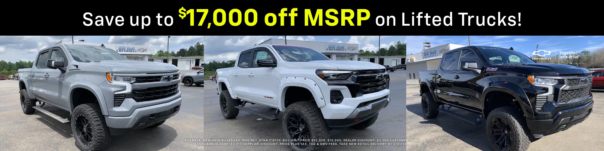 At Bill Holt Chevrolet of Blue Ridge, we're committed to providing our customers with the best selection of lifted trucks and exceptional customer service. With our knowledgeable sales team, flexible financing options, and top-notch service department, we're here to help you find the perfect truck to suit your needs and budget. Visit us near Blue Ridge, GA and Canton, GA today and experience the difference for yourself.